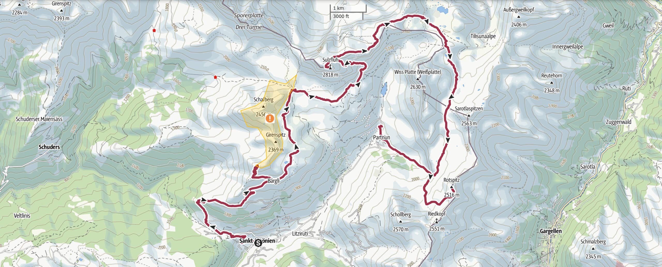 - Day 3: Tilisunahütte to Partnun, including the Rotspitz (2.516 m). 14,0 kilometers, 730 m ascent, 1.500 m descent. Bus or step to St. Antönien.