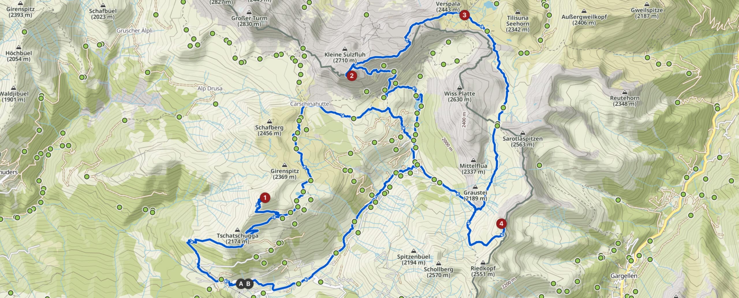 - Day 2: Berghaus Sulzfluh to Tilisunahütte, including the Sulzfluh (2.817 m). 9,0 kilometers, 1.000 m ascent, 550 m descent.